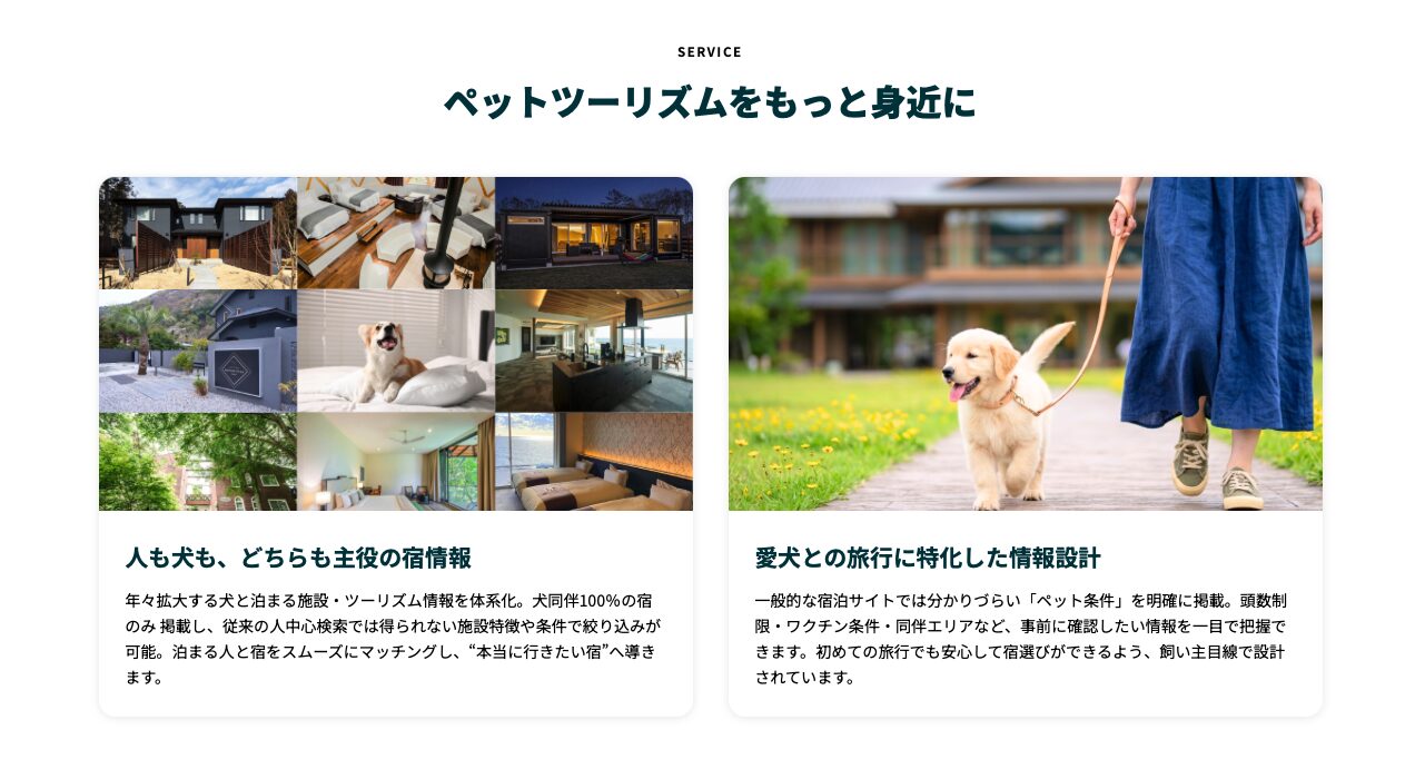 年々拡大する犬と泊まる施設・ツーリズム情報を体系化。犬同伴100%の宿のみ 掲載し、従来の人中心検索では得られない施設特徴や条件で絞り込みが可能。泊まる人と宿をスムーズにマッチングし、“本当に行きたい宿”へ導きます。