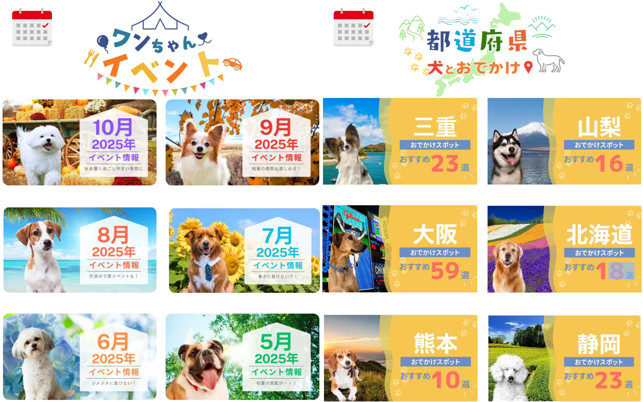 「犬イベントまとめ」「全国のペット同伴OKスポット」「屋内お出かけガイド」など、季節やタイミングに応じた最新記事が続々登場。